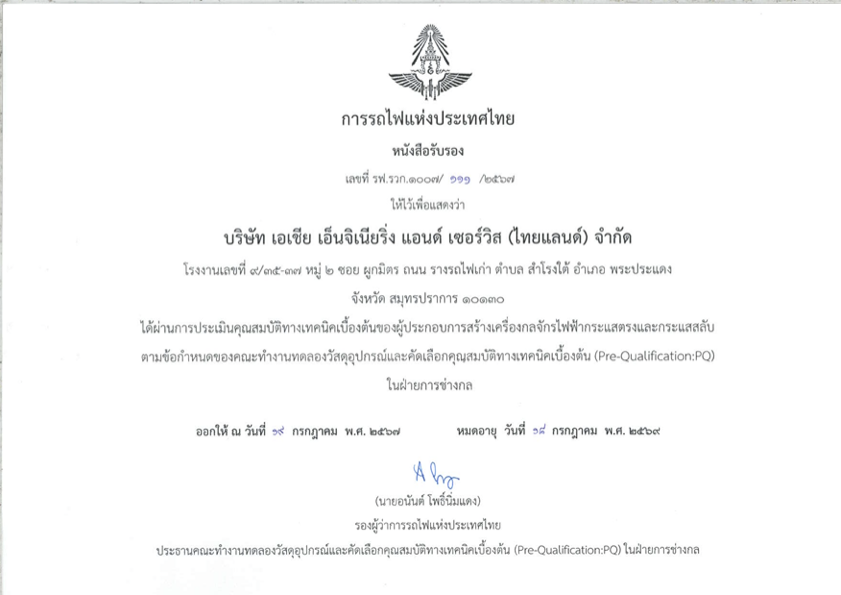 Established in 1991, Asia Engineering & Service (Thailand) Co. Ltd aims to provide the engineering industry with a variety of motor and electrical machinery. Our highly experienced engineers are dedicated and prioritize excellent customer services, thus providing high-quality service and outstanding results. Our company provides services such as renewing and rebuilding machinery, replacing equipment as well as repairing them, Train interior part and operate manufacturing sales. We are in-depth with research and developments in engineering machinery as well as designing cutting edge-technological equipment. In addition, our company provides urban rail transit vehicles, lease and technical services for rolling stock, local logistics, protective equipment, industrial investment, and management services. As an effort to achieve a high-quality service and outcome, we aim to adhere to the quality standards as stipulated in the ISO 9001:2000 in our operational processes.